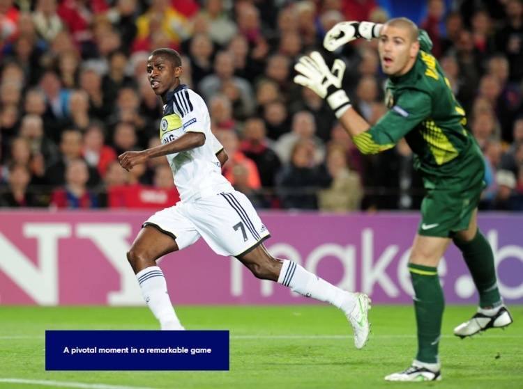 11-12赛季欧冠半决赛切尔西对阵巴萨,首回合蓝军主场1-0取胜。次回合双方在诺坎普展开决战,上半场布斯克茨和伊涅斯塔各入一球,巴萨2-0领先,总比分2-1反超。而且蓝军队长特里染红下场。
